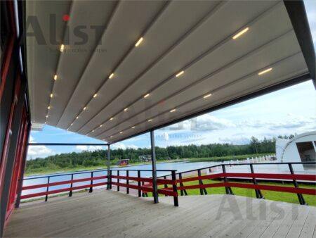 Компания Alist предлагает несколько моделей пергол для террас, ресторанных площадок, открытых зон патио загородного дома. Конструкцию выполняют после замеров и всех пожеланий заказчика. Сам каркас, консоли, тянущие каретки, заглушки делают из алюминия, а для полотна используются только качественные ПВХ ткани ведущих европейских производителей.
